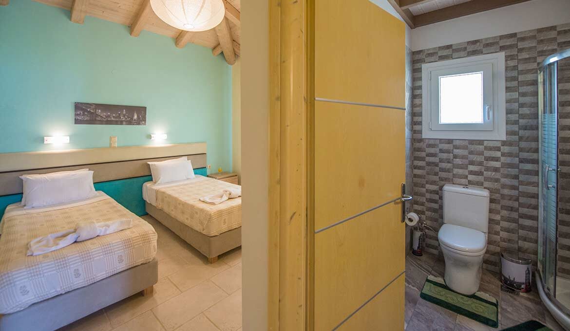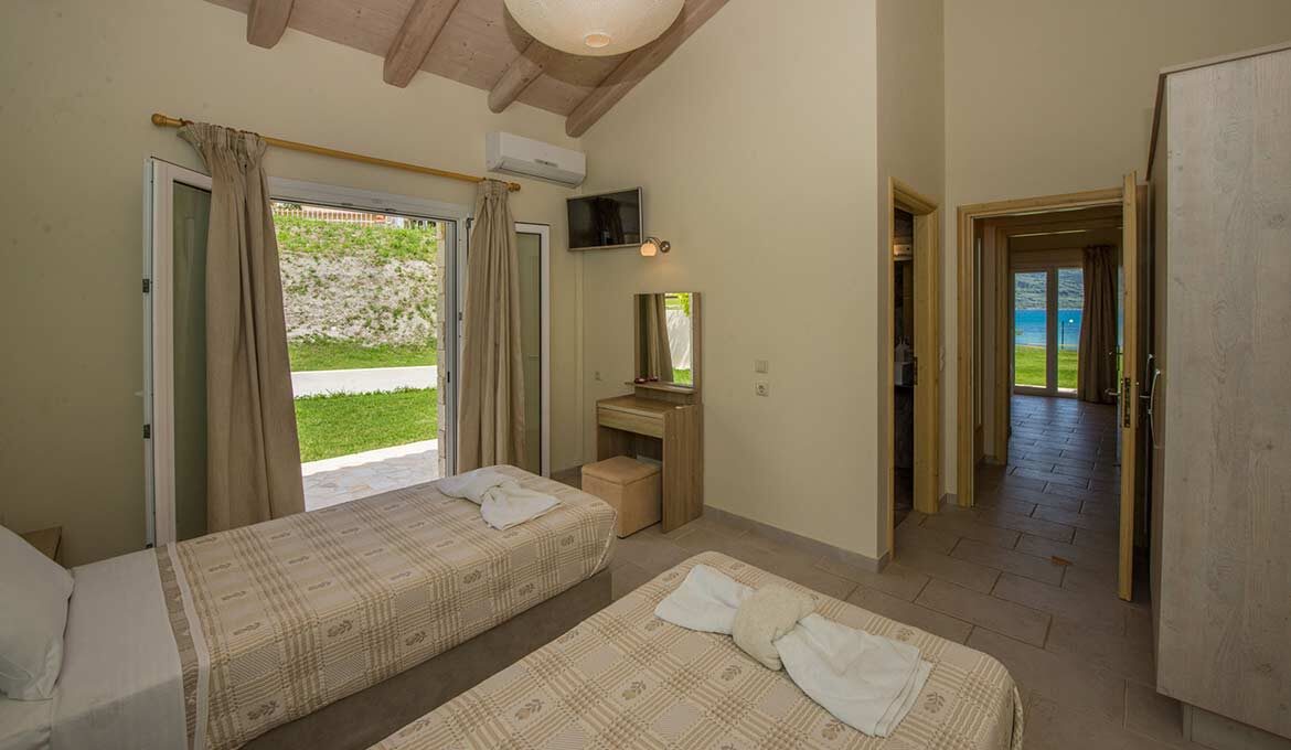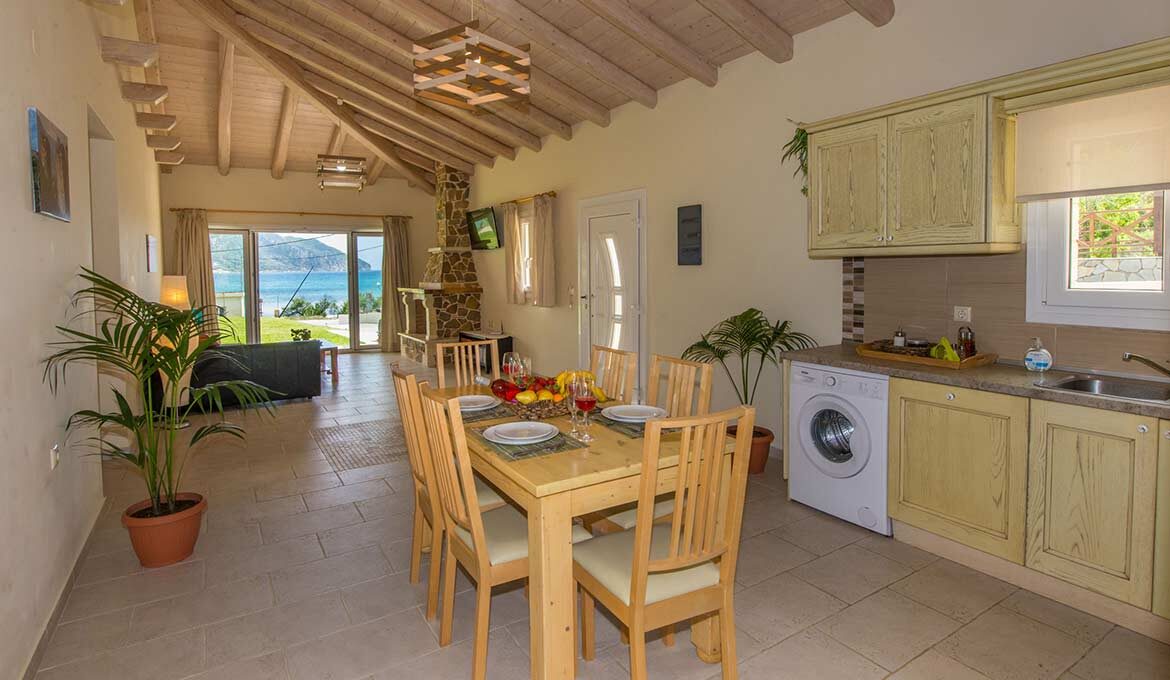 Indoors there are 2 bedrooms with en suite showers. One bedroom has a double bed and the other has twin beds, both have access to the verandas. The open plan kitchen is fully equipped with all amenities (fridge,washing machine , cooker, kettle ,Espresso and filter coffee machine, microwave, dishes and utensils).The dining area can seat up to 6 people.The living room features a large sofa bed , flat screen TV, fireplace and a large glazing door with garden and sea views. Facilities at the villa include full air-conditioning and free wifi.